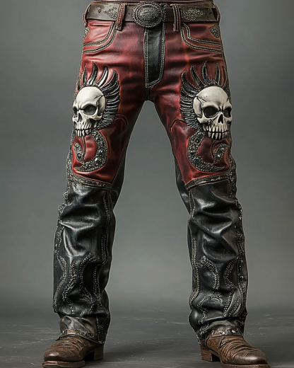 skull embroidered contrast color stitching rivet leather pants cb8f