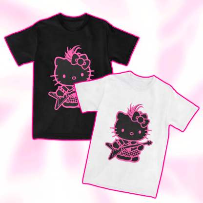 Featuring Hello Kitty in a punk-rock inspired outfit, complete with electric guitar — this tee combines kawaii charm with edgy attitude. A must-have for fans who want to stand out while staying cute.