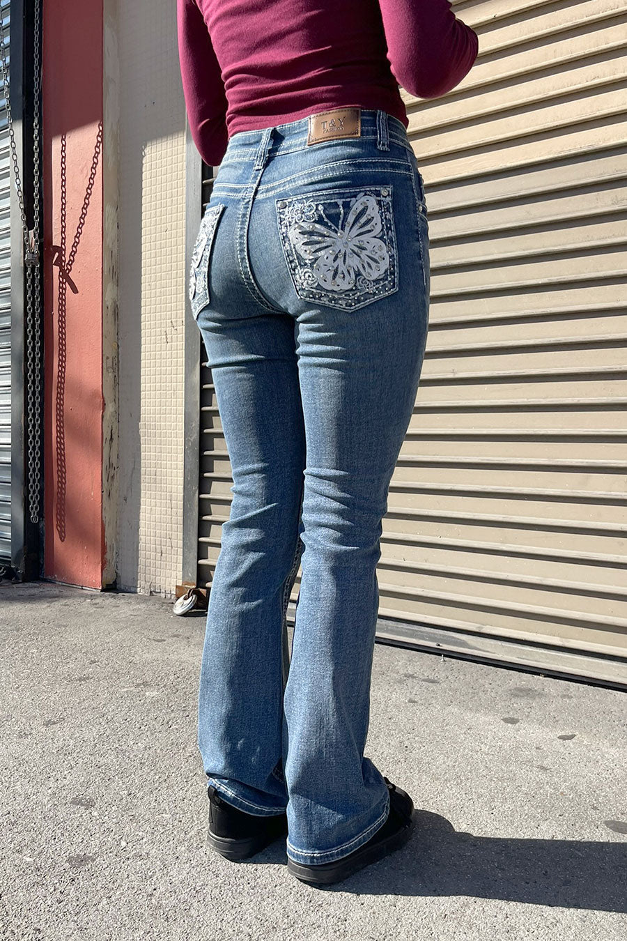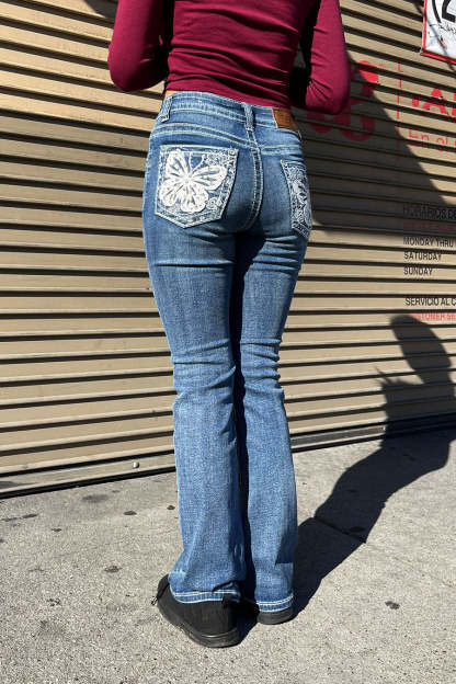 - Style Description: 2000s Style Butterfly Patch Rhinestone Bling Back Pocket Bootcut Jean with Good Stretch