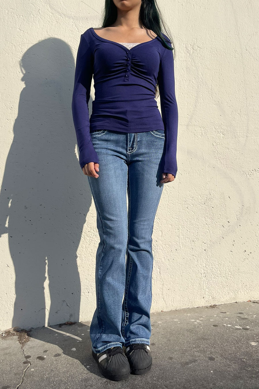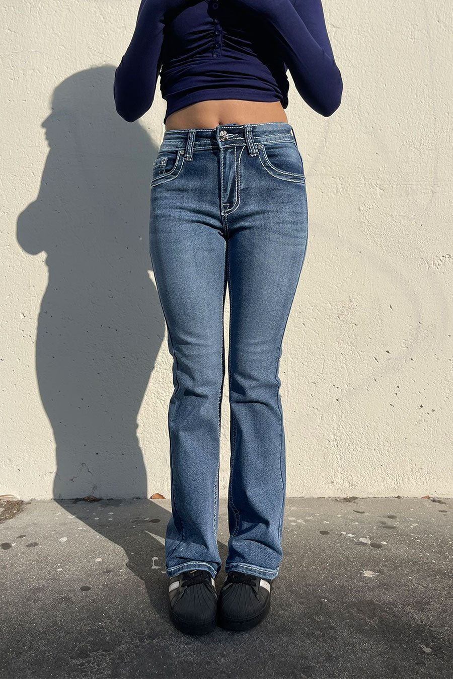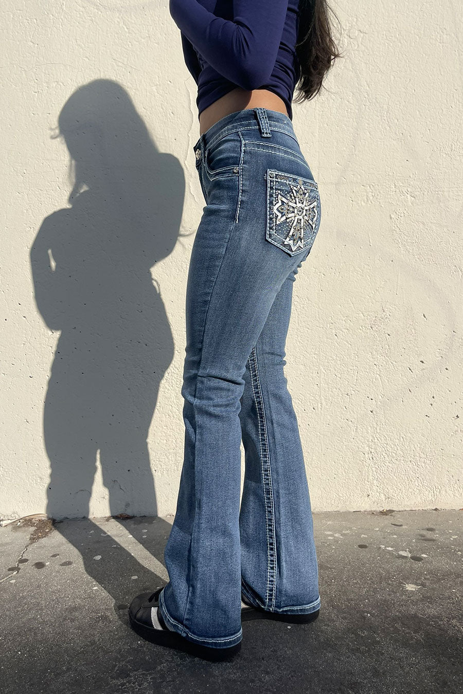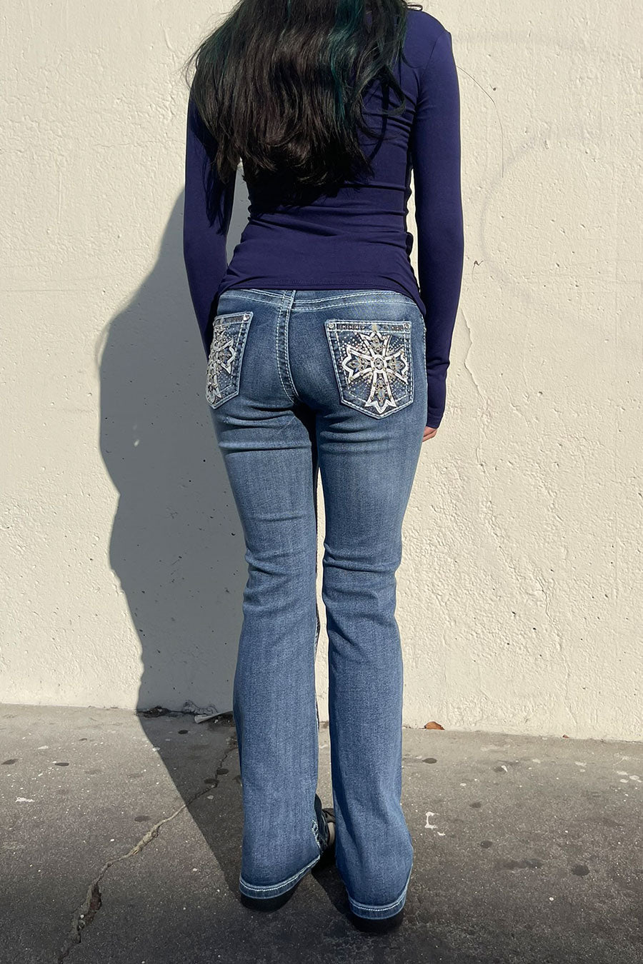 - Style Description: 2000s Style Chrome Heart Cross Rhinestone Bling Back Pocket Bootcut Jean with Good Stretch