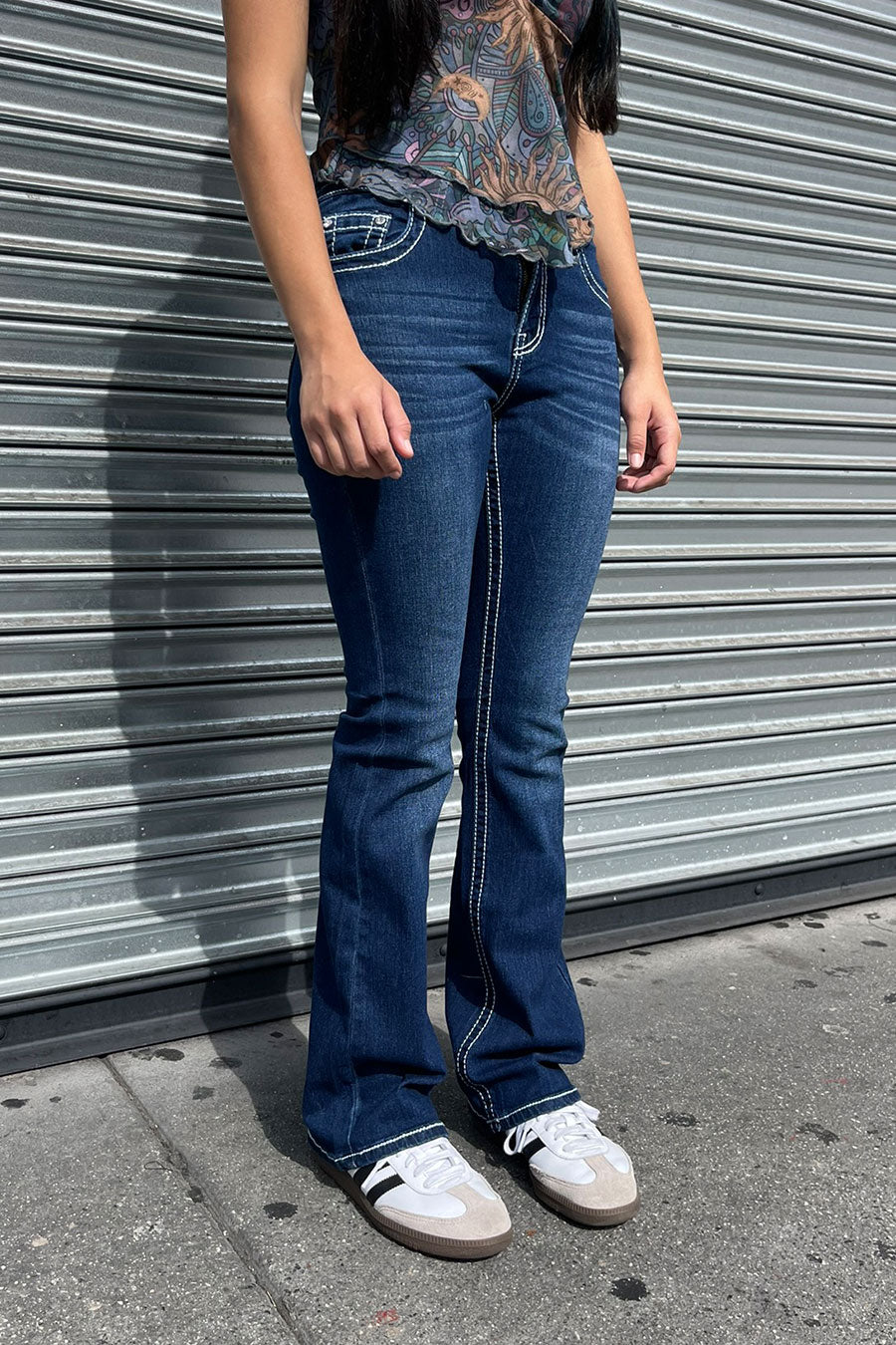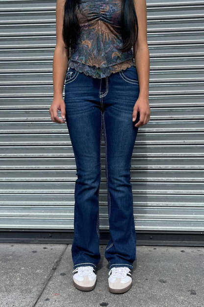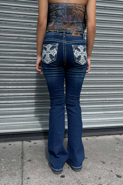 - Style Description: 2000s Style Cross Rhinestone & Studded Bling Back Pocket Bootcut Jean with Good Stretch