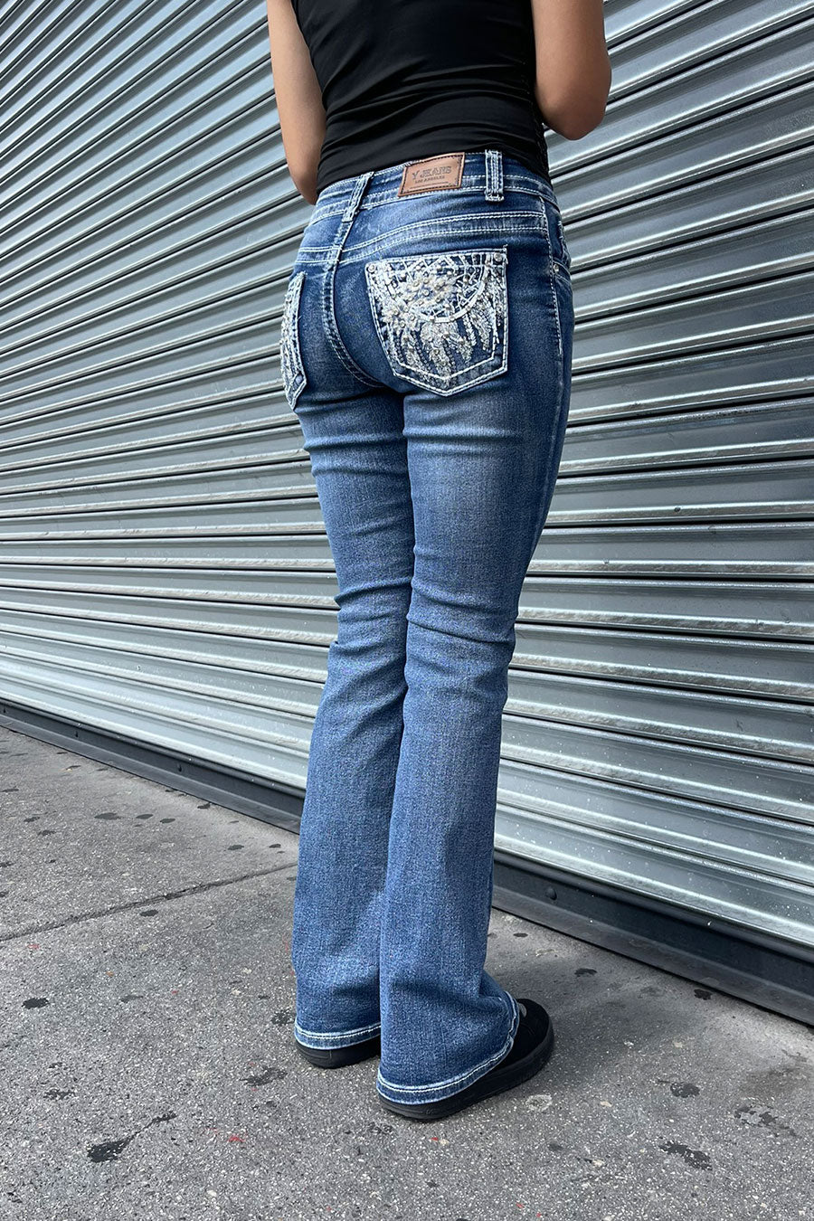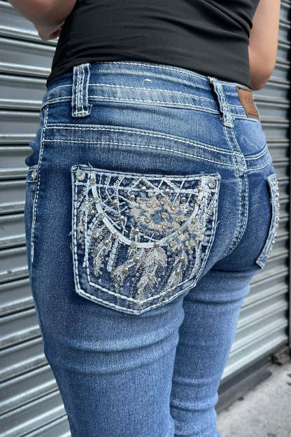 - Style Description: 2000s Style Floral Dreamcatcher Embroidered Rhinestone Bling Back Pocket Bootcut Jean with Good Stretch