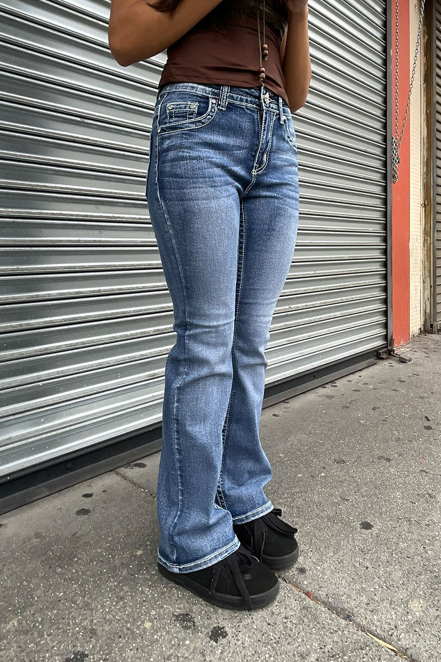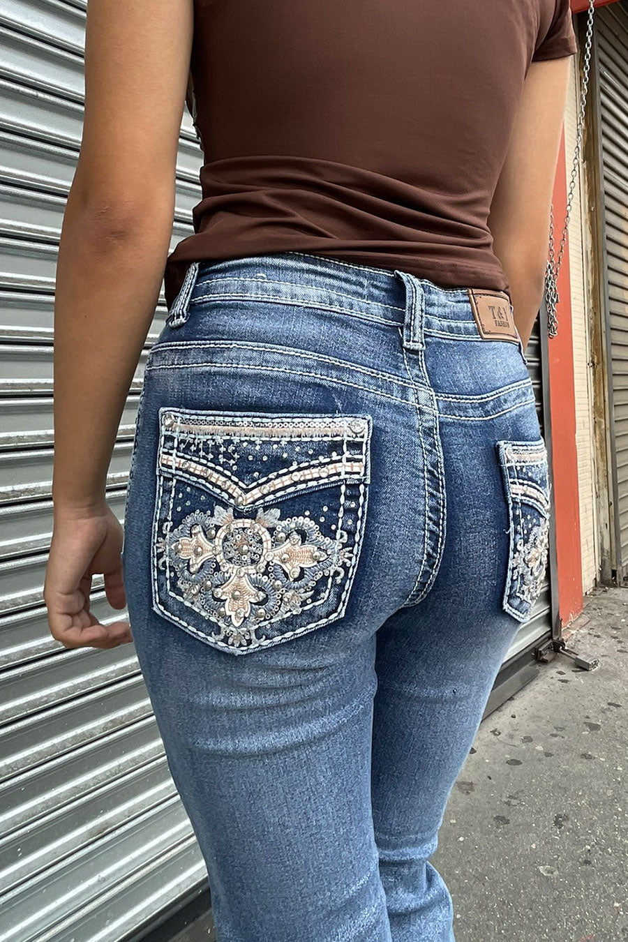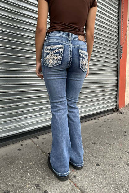 - Style Description: 2000s Style Sand-Washed Faux Pocket & Cross Patch Rhinestone Bling Back Pocket Bootcut Jean with Good Stretch (Darker Shade Sand Wash)
