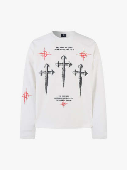 • Design Elements: Central cross graphic print, red starburst accents, inspirational text