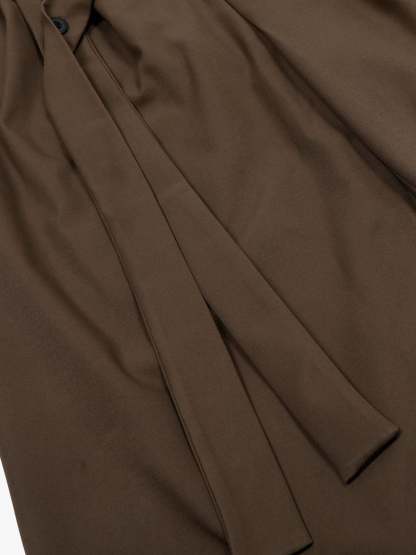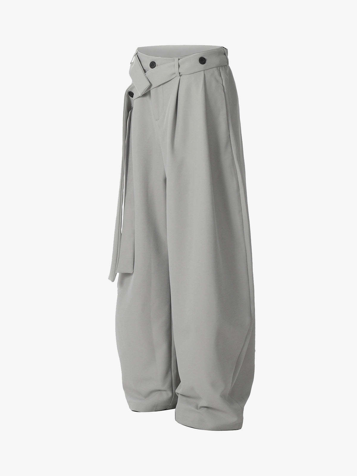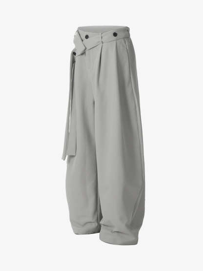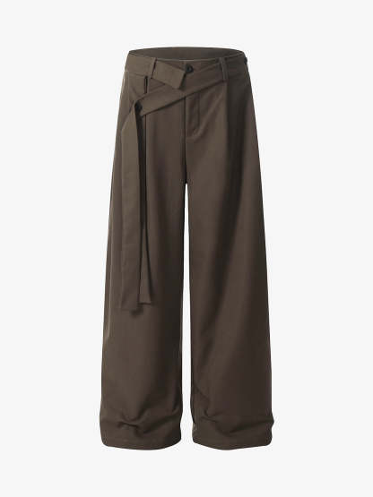 • Detail Features: Wrap belt design, wide-leg cut, button closure at the waist