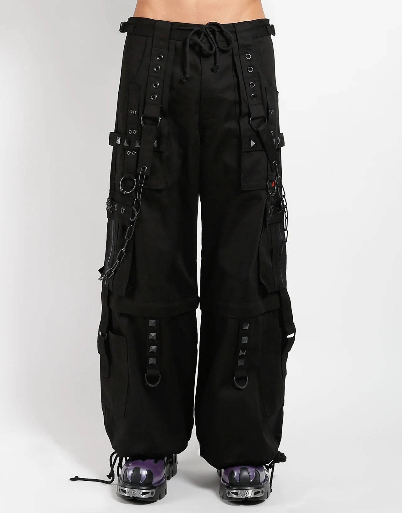 These black pants zip off into shorts and feature all black hardware, removable straps, adjustable ankles, D-rings, buckles, and deep pockets.