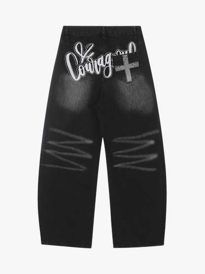 • Detail Features: Embroidered text on the back pocket, cross patch design, distressed details on the legs